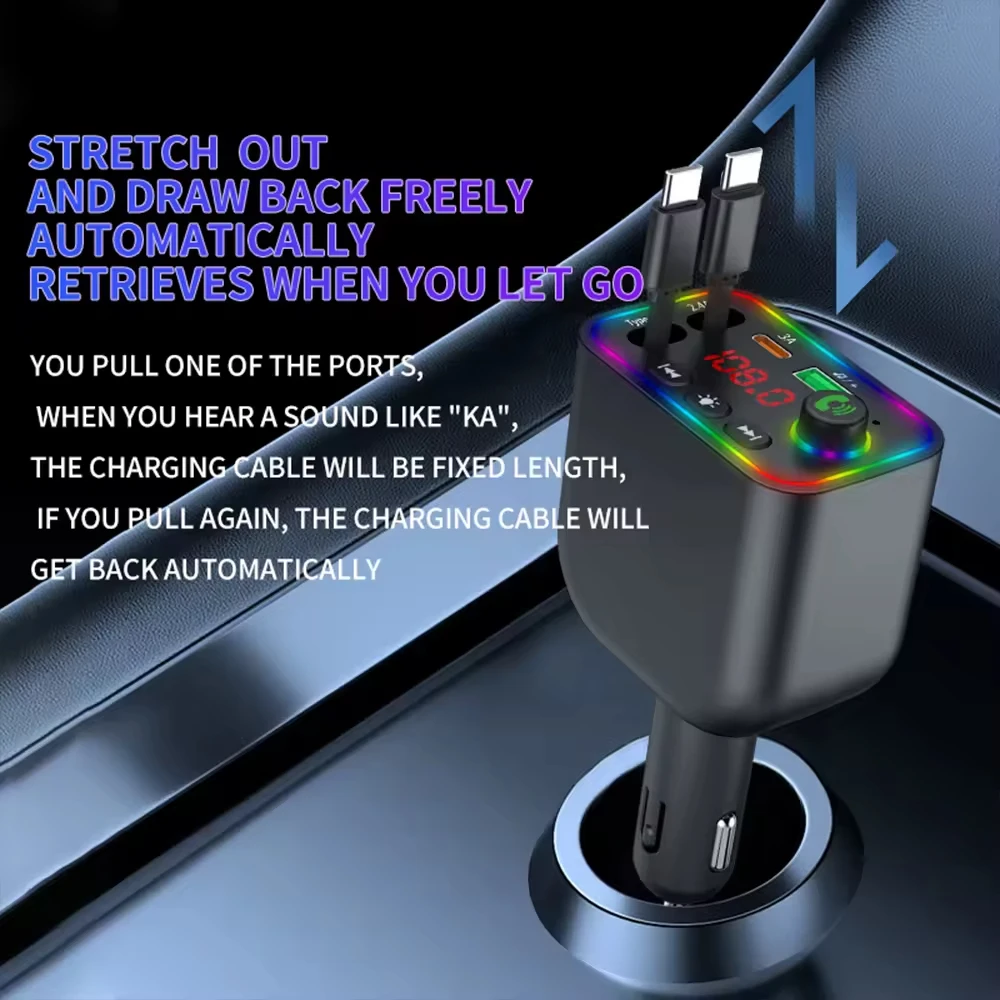 • Retractable Charging Cables – To enhance your driving experience, our car bluetooth connector includes a 30 W USB C and a 25 W USB iPhone retractable cable, eliminating the need for extra cords and effortlessly charging for both Iphone and Android devices. The retractable cables of car bluetooth device usb extend up to 80cm and retract smoothly for a tidy car interior.